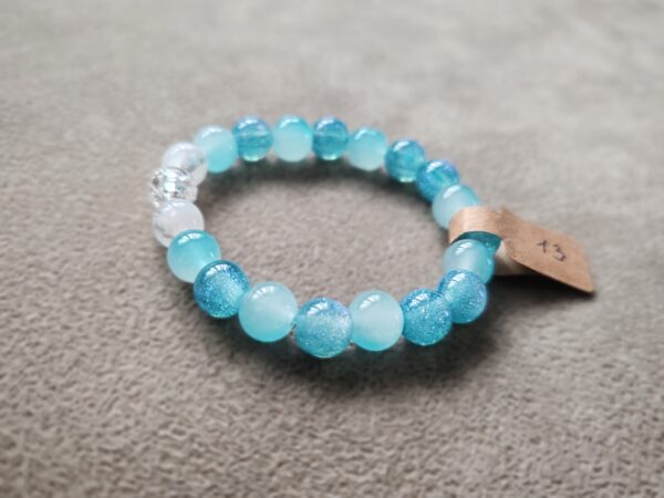 A karkötő 8 mm-es gyöngyökből készült. Kerülete 13 cm, gyerekeknek ajánlott.